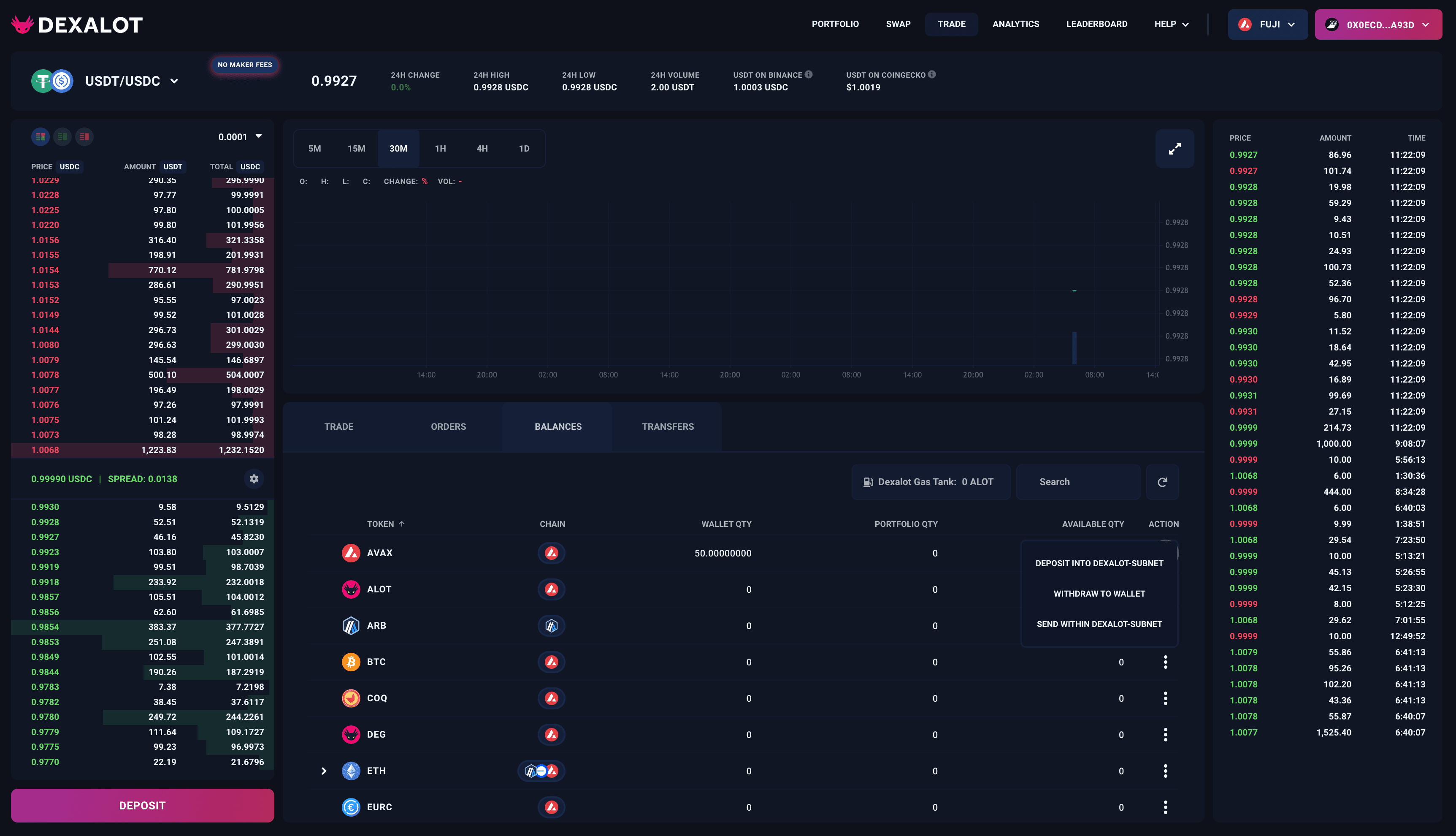 The Avalanche L1 (Dexalot) we used was highly specialized for our use case and very cheap. We actually got all the gas token ALOT we needed airdropped, just for bridging assets over. The only fees we had to pay were for bridging. Usually, we would not have done this for a single operation, so these costs do not occur for a single trade, but only for depositing and withdrawing from the portfolio.